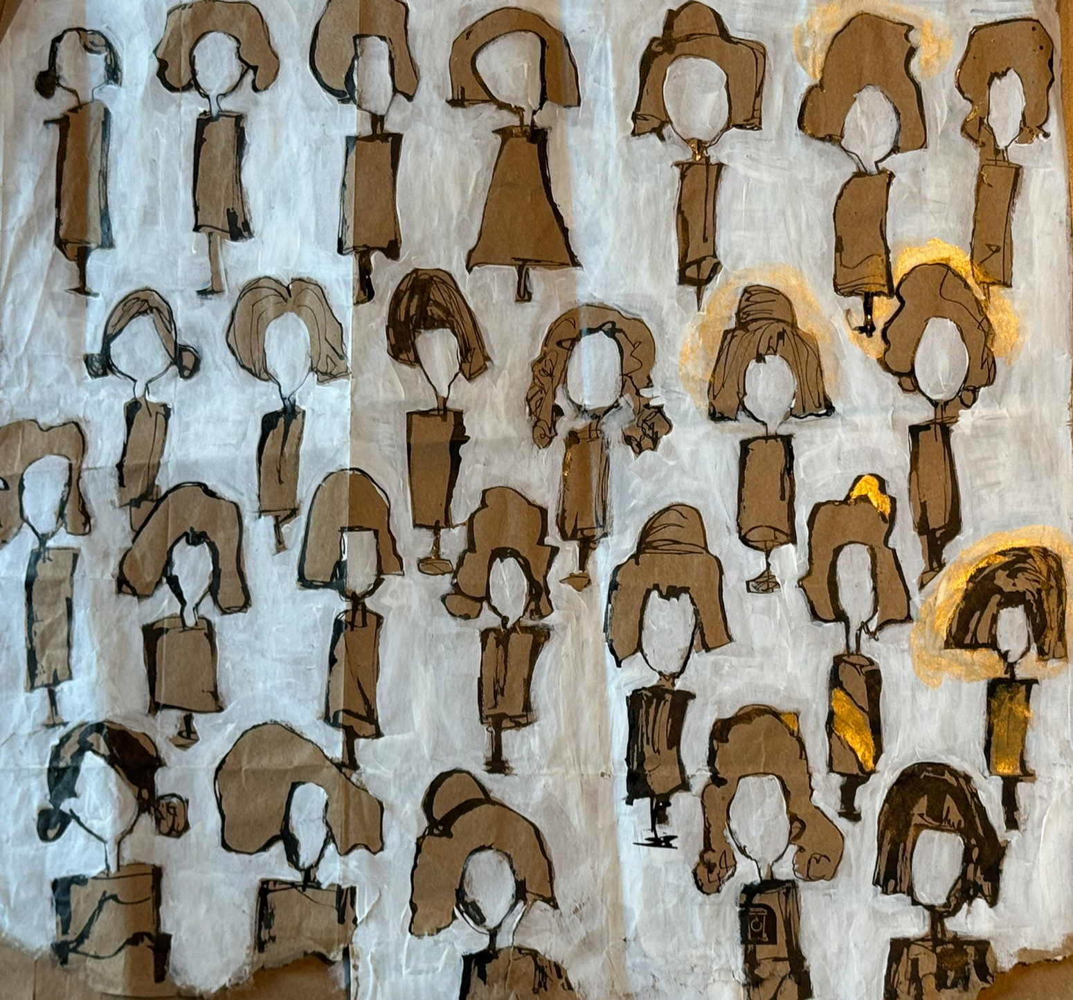 Themes of feminine strength and solidarity infuse Lopp’s work. Inspired by the quiet spirit of the Japanese kokeshi, she explores images of women, men and families standing together.